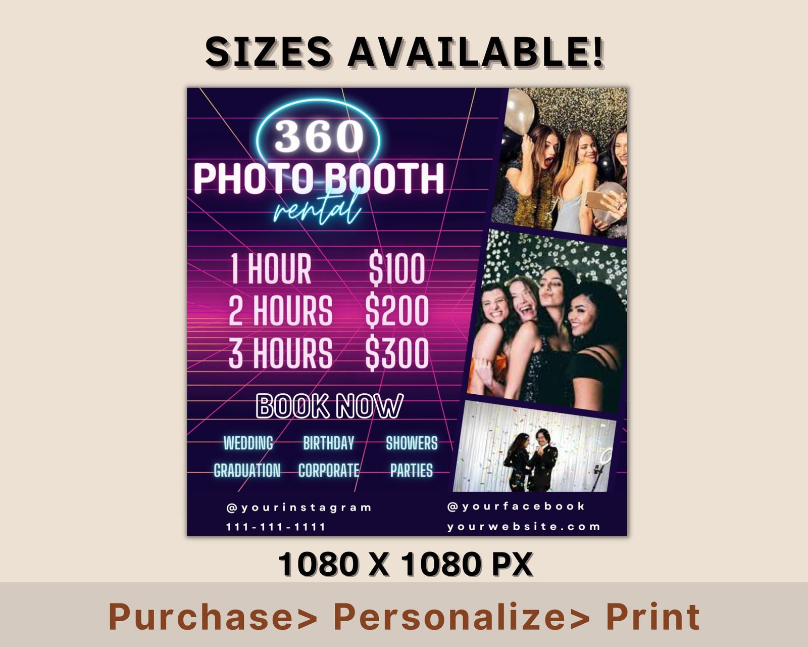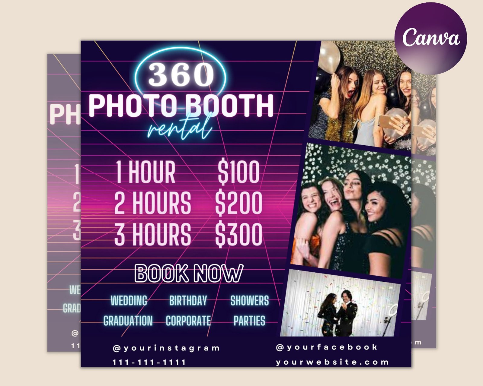 360 Photo Booth Rental Flyer | DIY Event Photography Rental Party Celebration Photobooth Social Media Instagram Editable Canva Template
