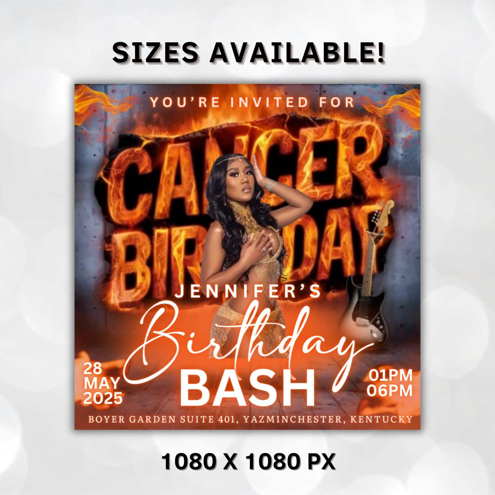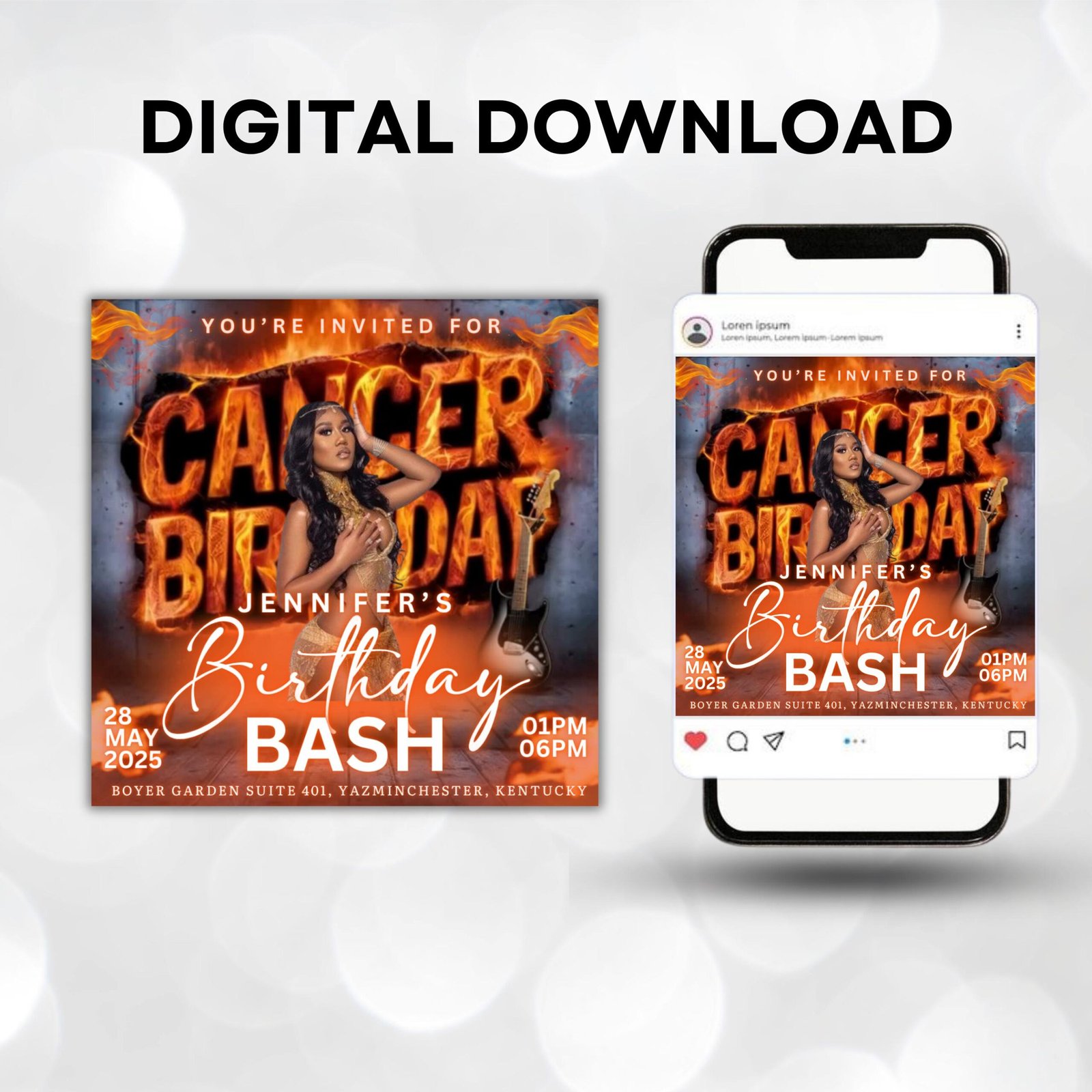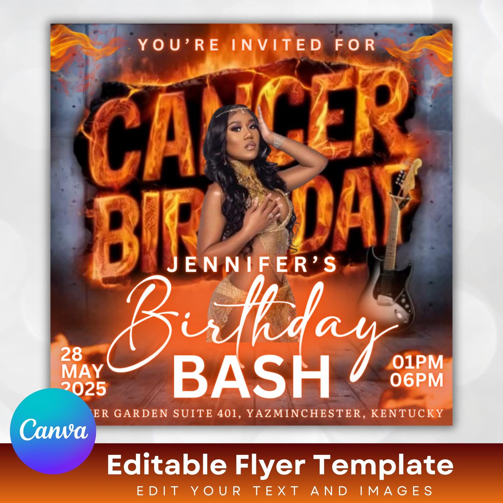 Celebrate like a true Cancer with this elegant Cancer Birthday Flyer Template! Perfect for promoting birthday parties, events, or club nights. Fully editable in Canva, this digital flyer features zodi
