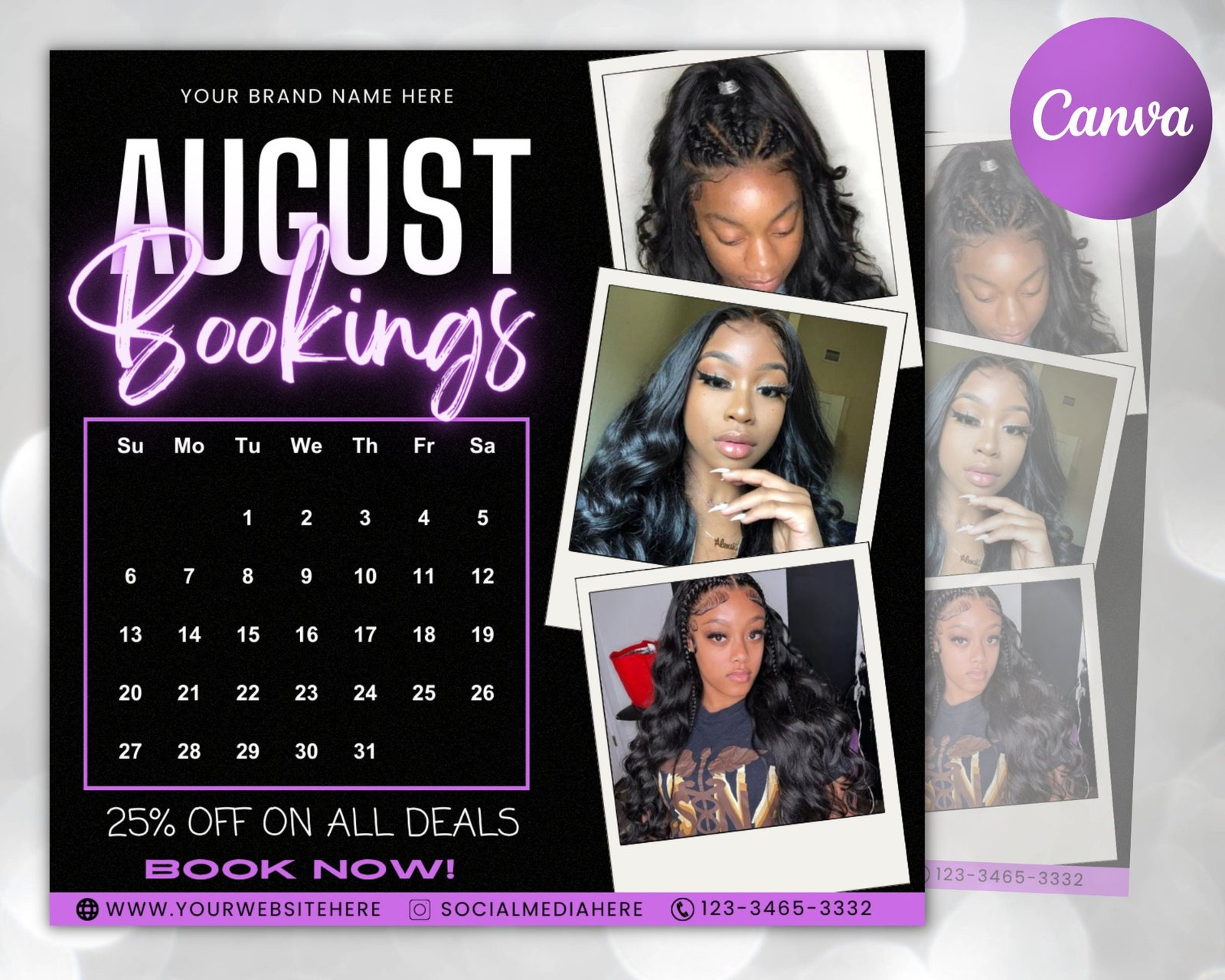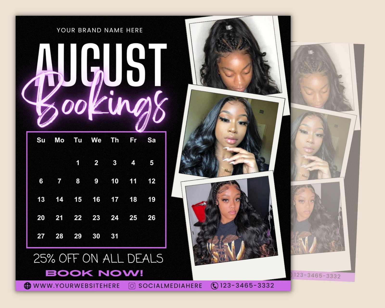 Boost your bookings and attract new customers with the August Bookings Flyer! This beautiful, sleek design is the perfect way to advertise your business and stand out from the