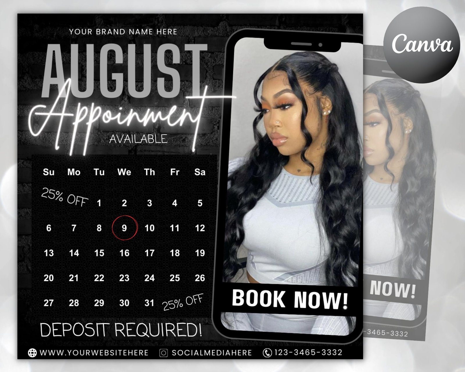 August bookings flyer, august bookings available, august appointment flyer, august calendar flyer, hair, nails, makeup, lashes, braids, wig