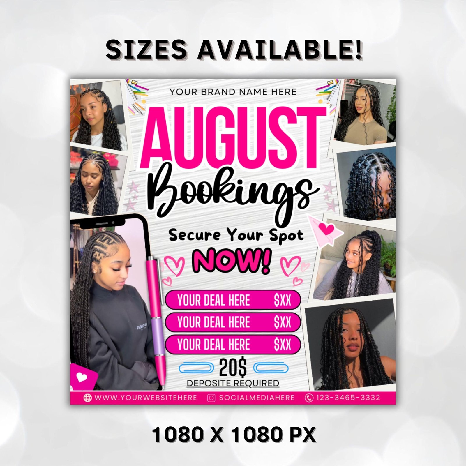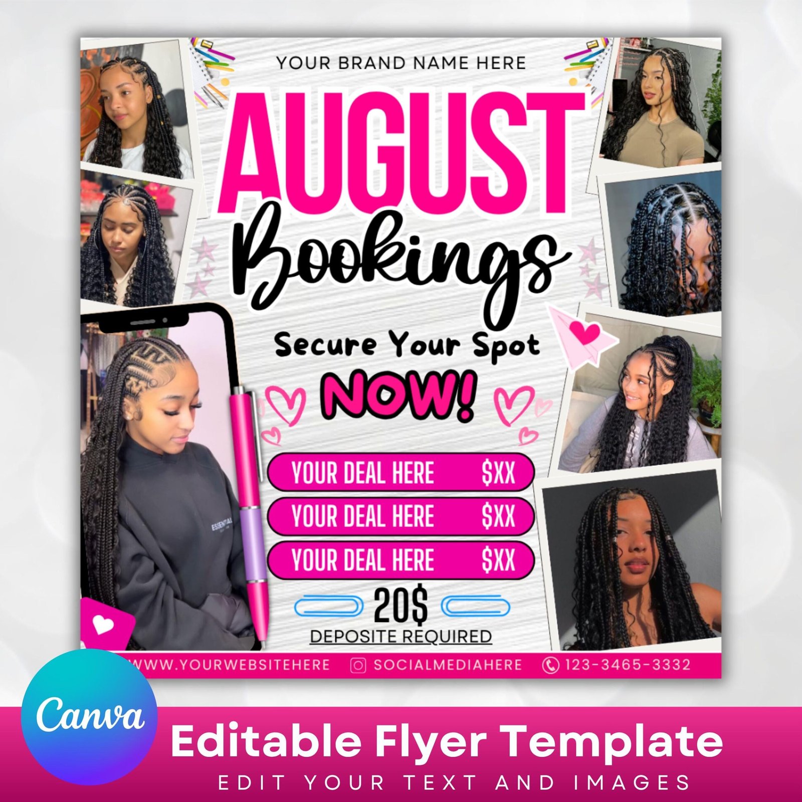 Introducing the August Bookings Hair Flyer, the perfect way to showcase your hair services this summer! This stylish and professional flyer will help you promote your beau