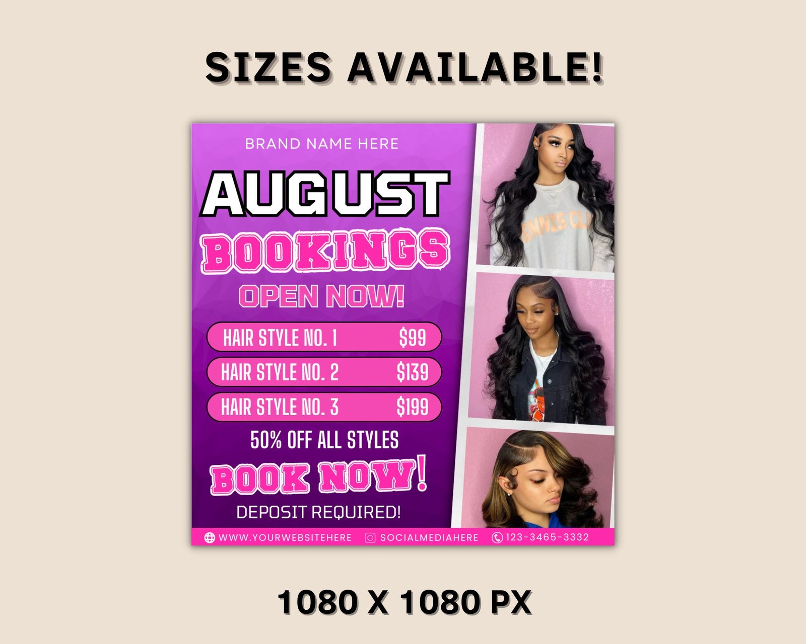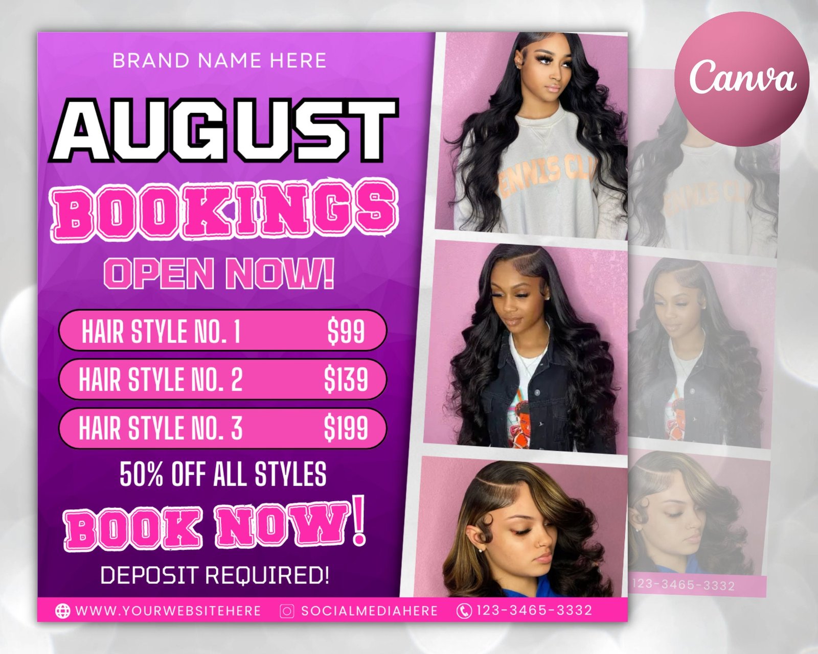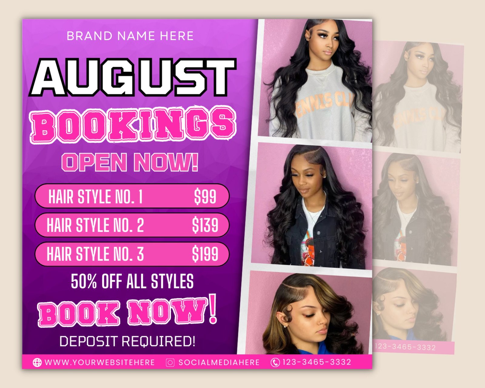 Introducing the August Bookings Hair Flyer, the perfect way to showcase your hair services this summer! This stylish and professional flyer will help you promote your beau