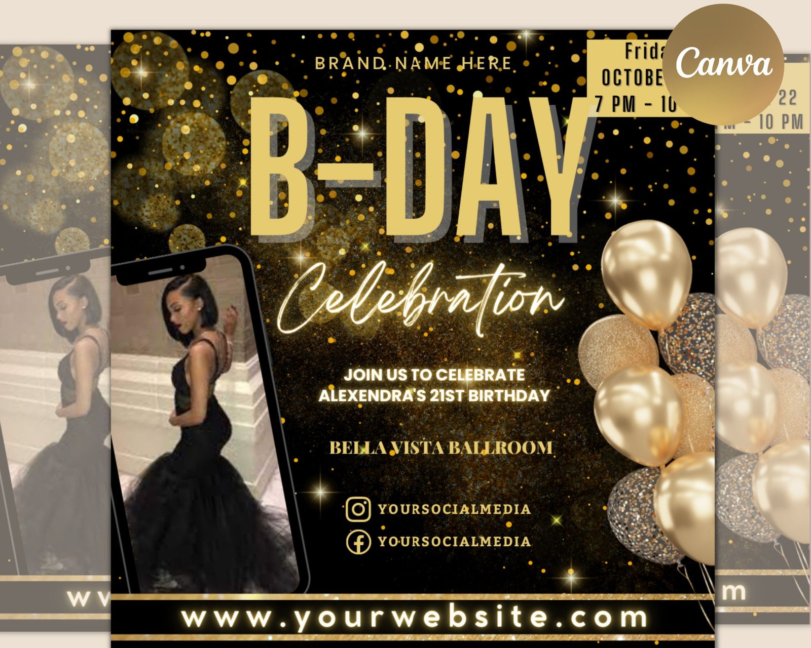 Birthday celebration flyer platinum template | diy bday invitation rsvp boutique hair lash nails social media instagram editable canva flyer