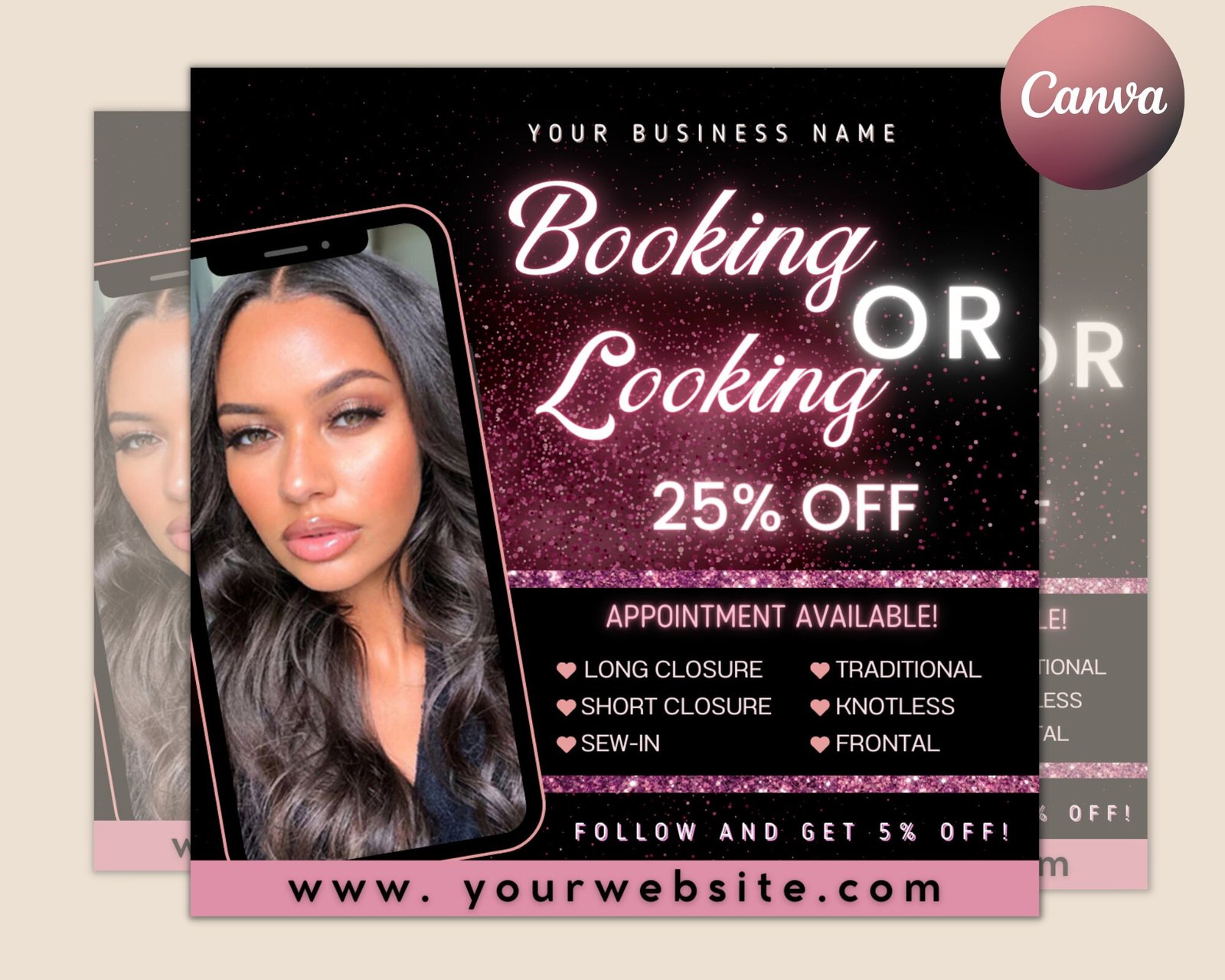 Booking or looking appointment flyer | diy book now available | social media instagram | hair lashes nails wigs makeup | canva template