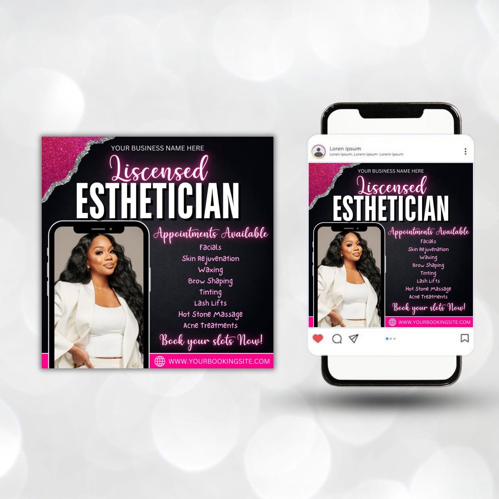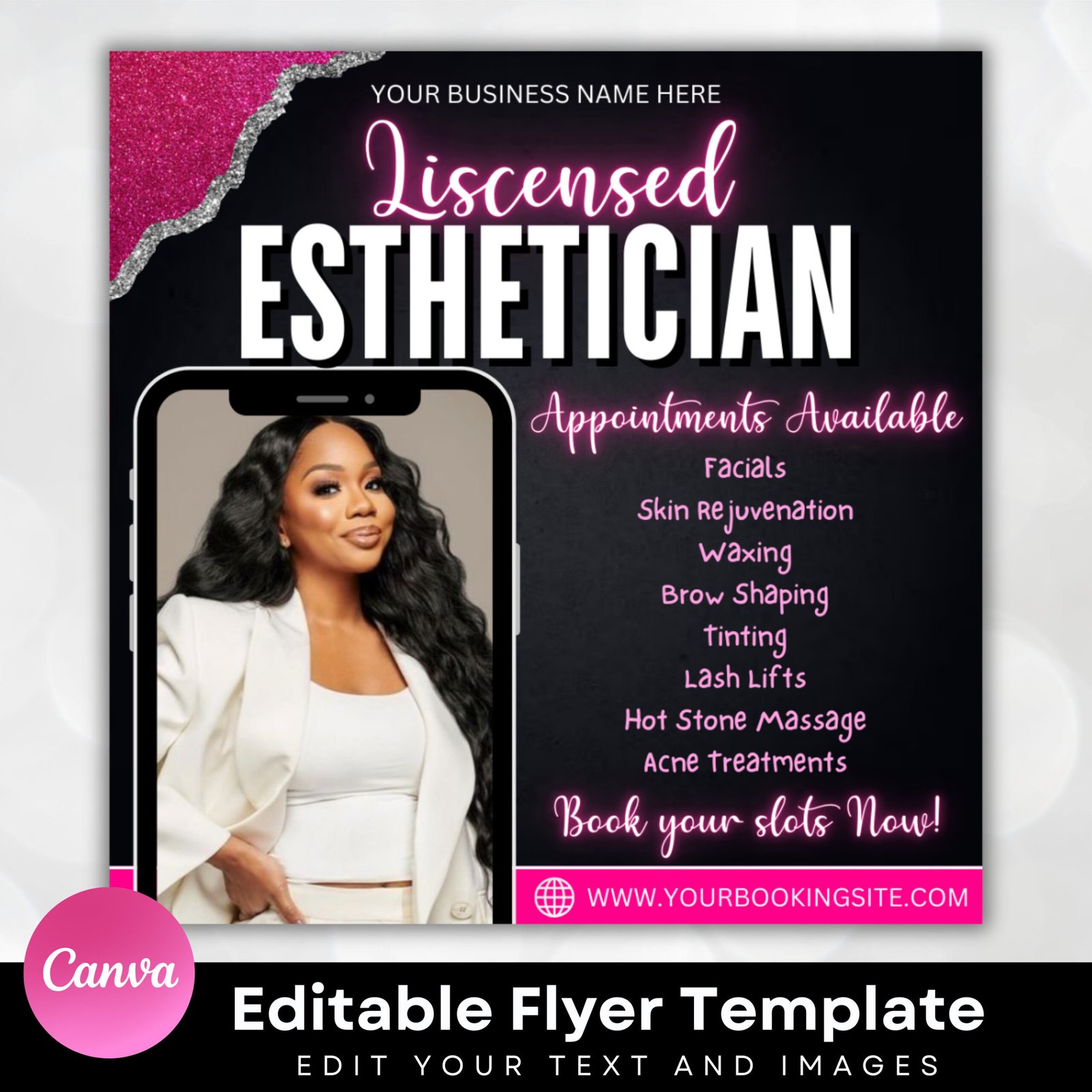 Attract new clients and showcase your services with our Esthetician Flyer Template! Designed specifically for beauty professionals, this stylish and customizable flyer is perfect for promoting your sk