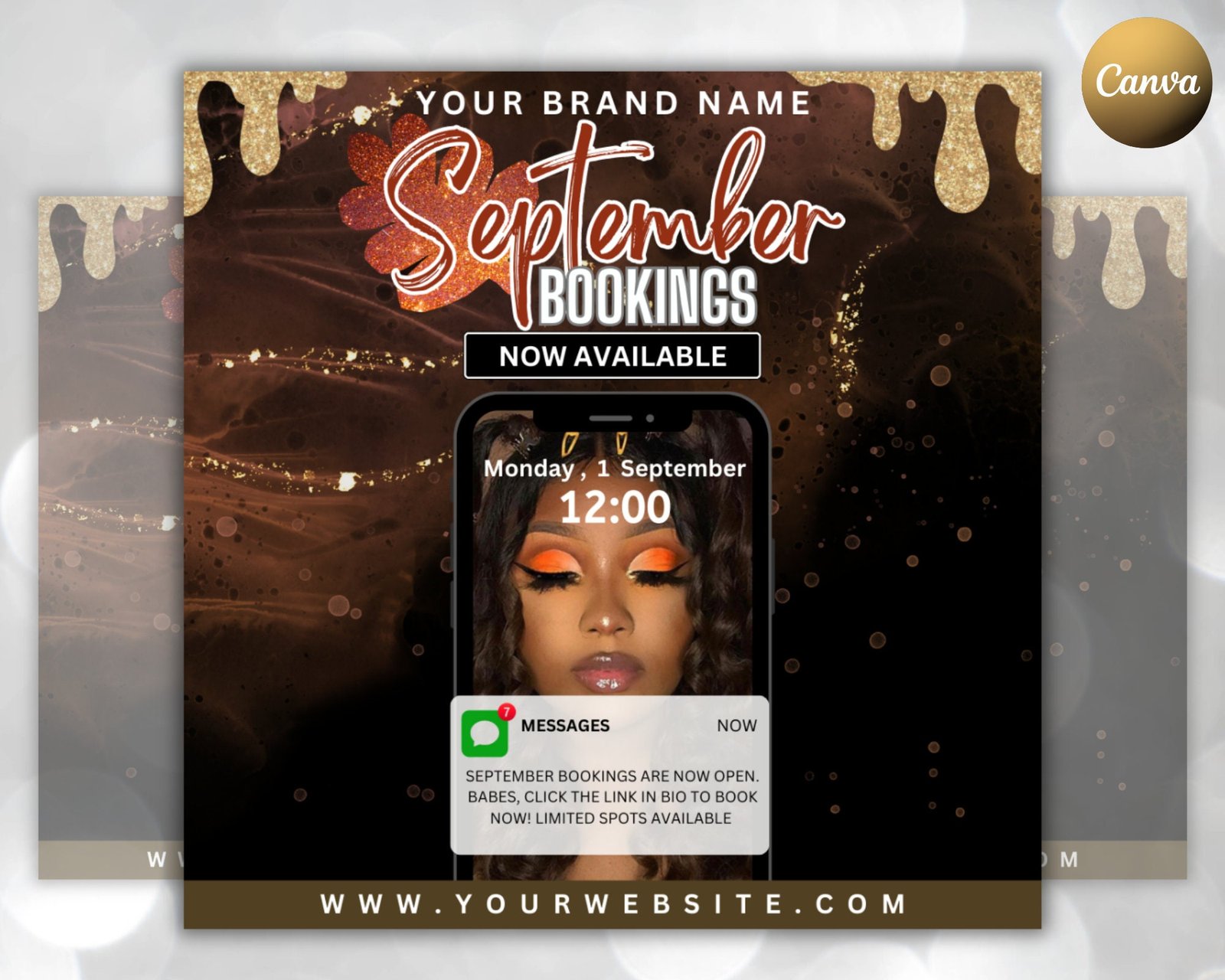 Editable september booking flyer, fall bookings available, appointment flyer, book now flyer, hair, nails, makeup lashes braids wigs