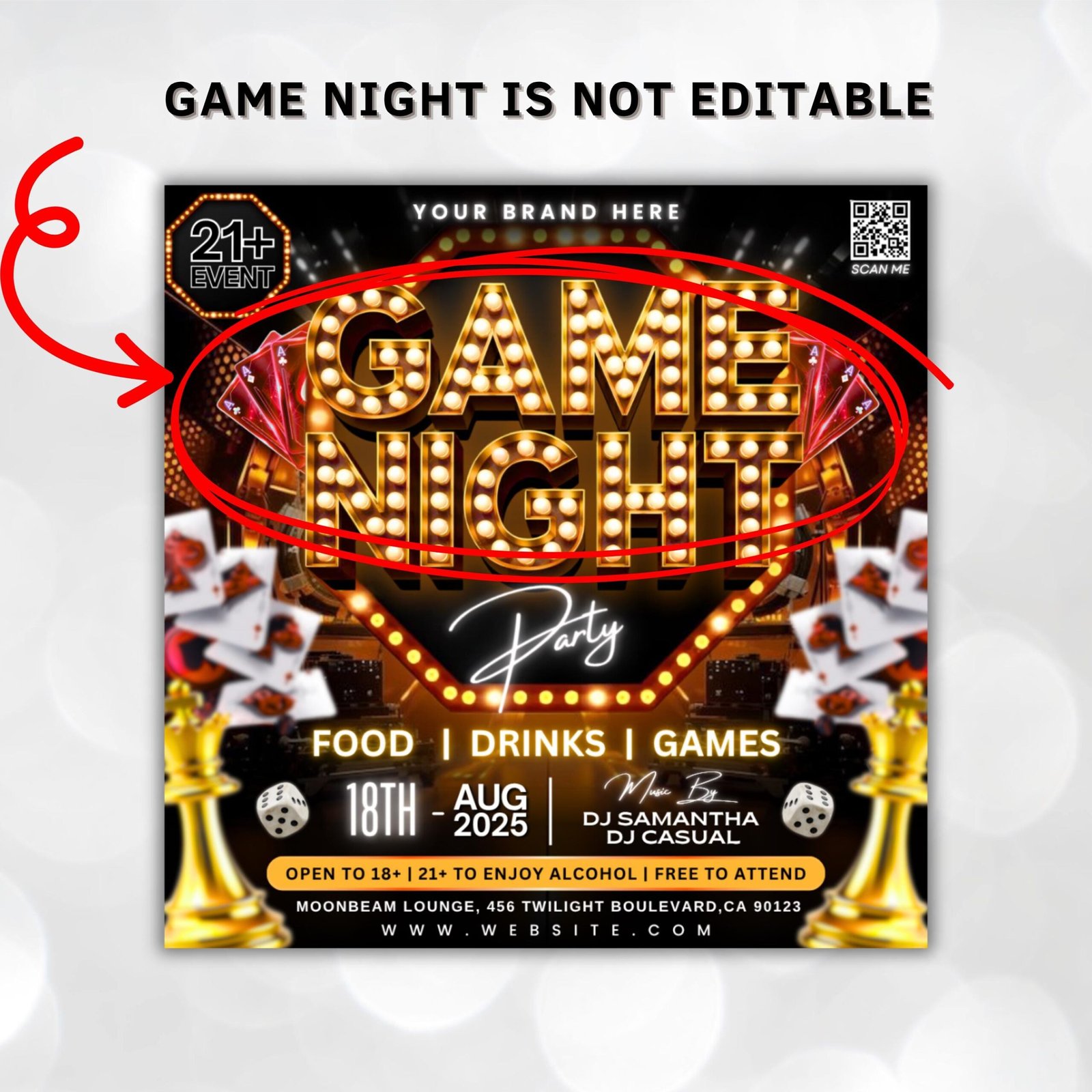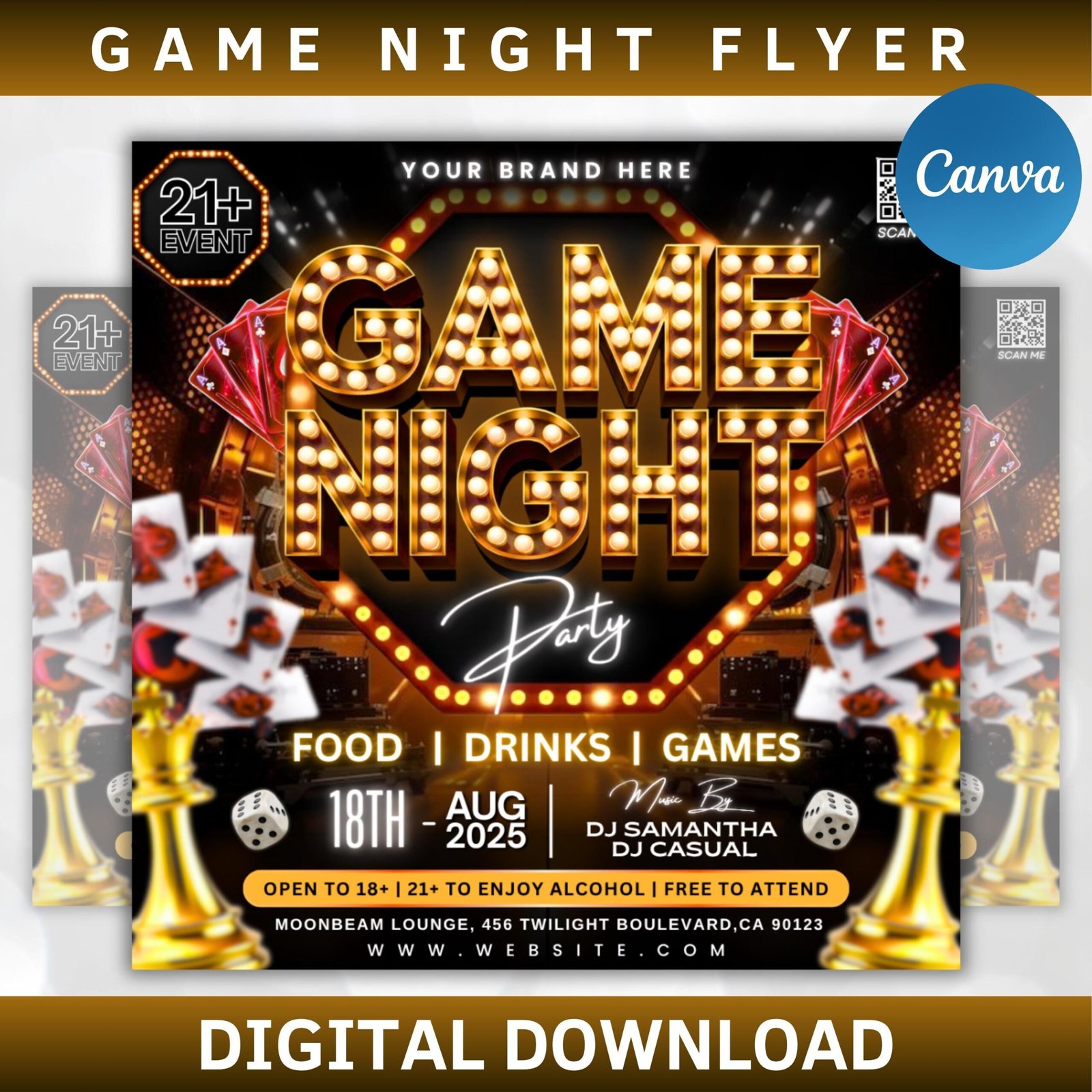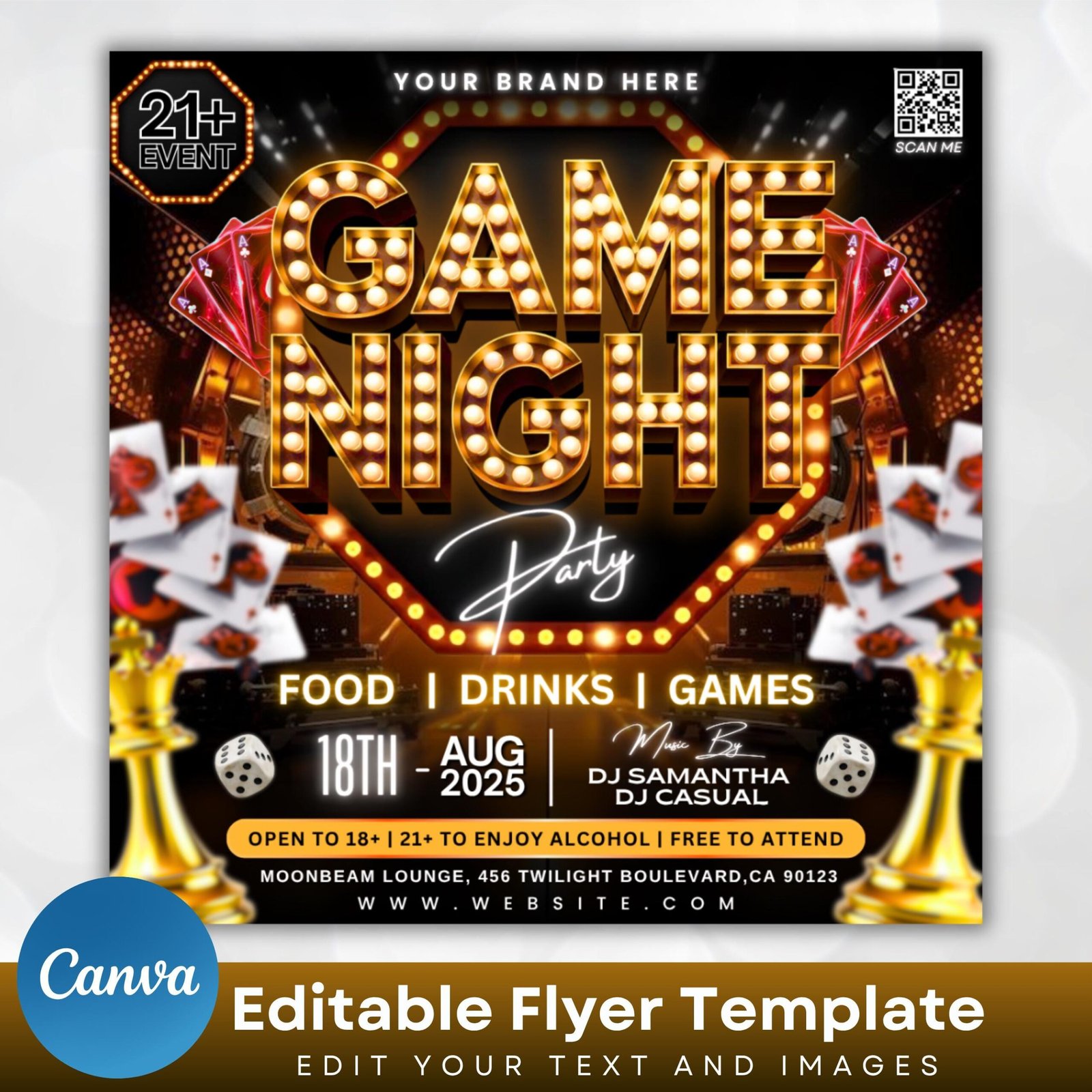 Get the party started with this **Game Night Flyer Template** – perfect for adult events, casino nights, or poker parties! Easily editable in Canva, this stylish flyer sets the tone for a fun-filled n
