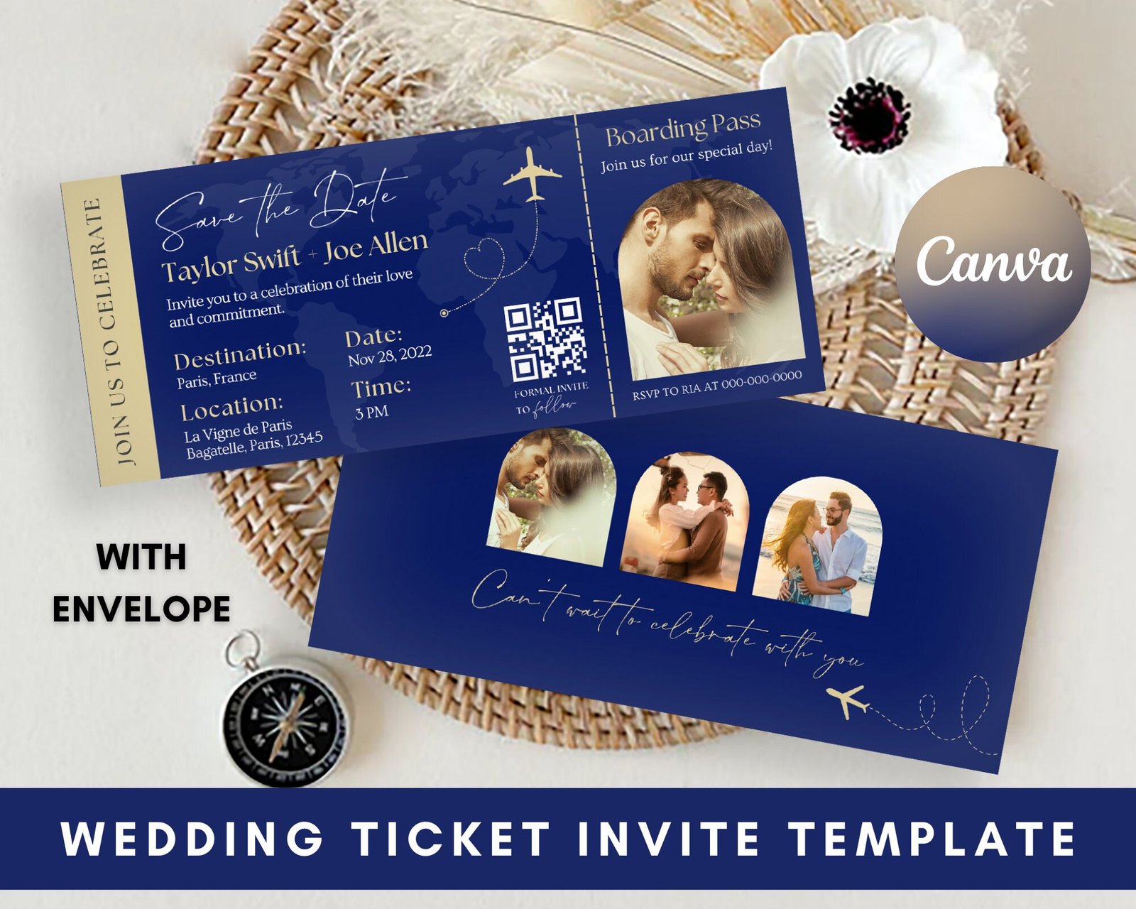 Gold and royal blue save the date ticket photo, wedding invite, custom boarding pass, wedding invitation, ticket wedding, save the date card