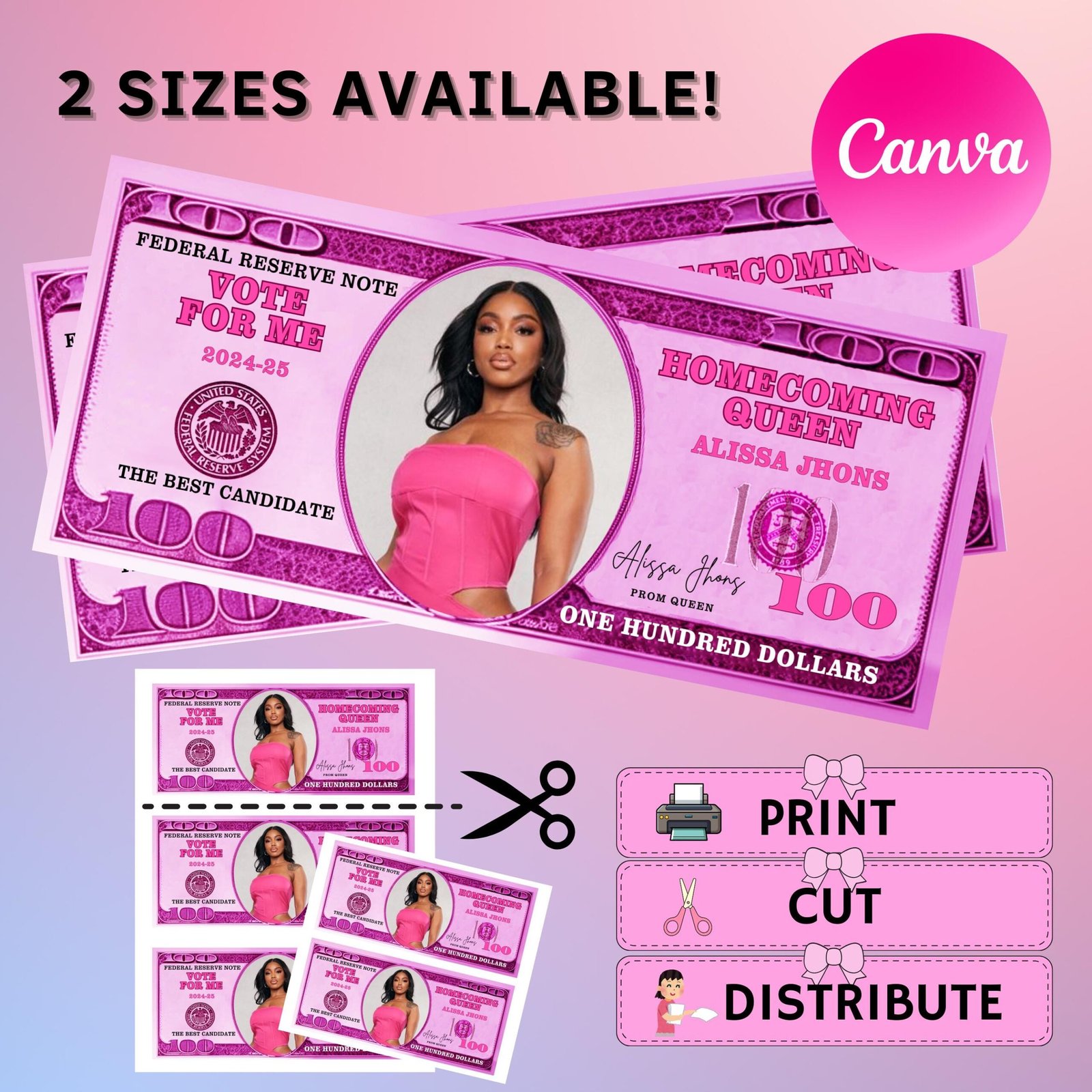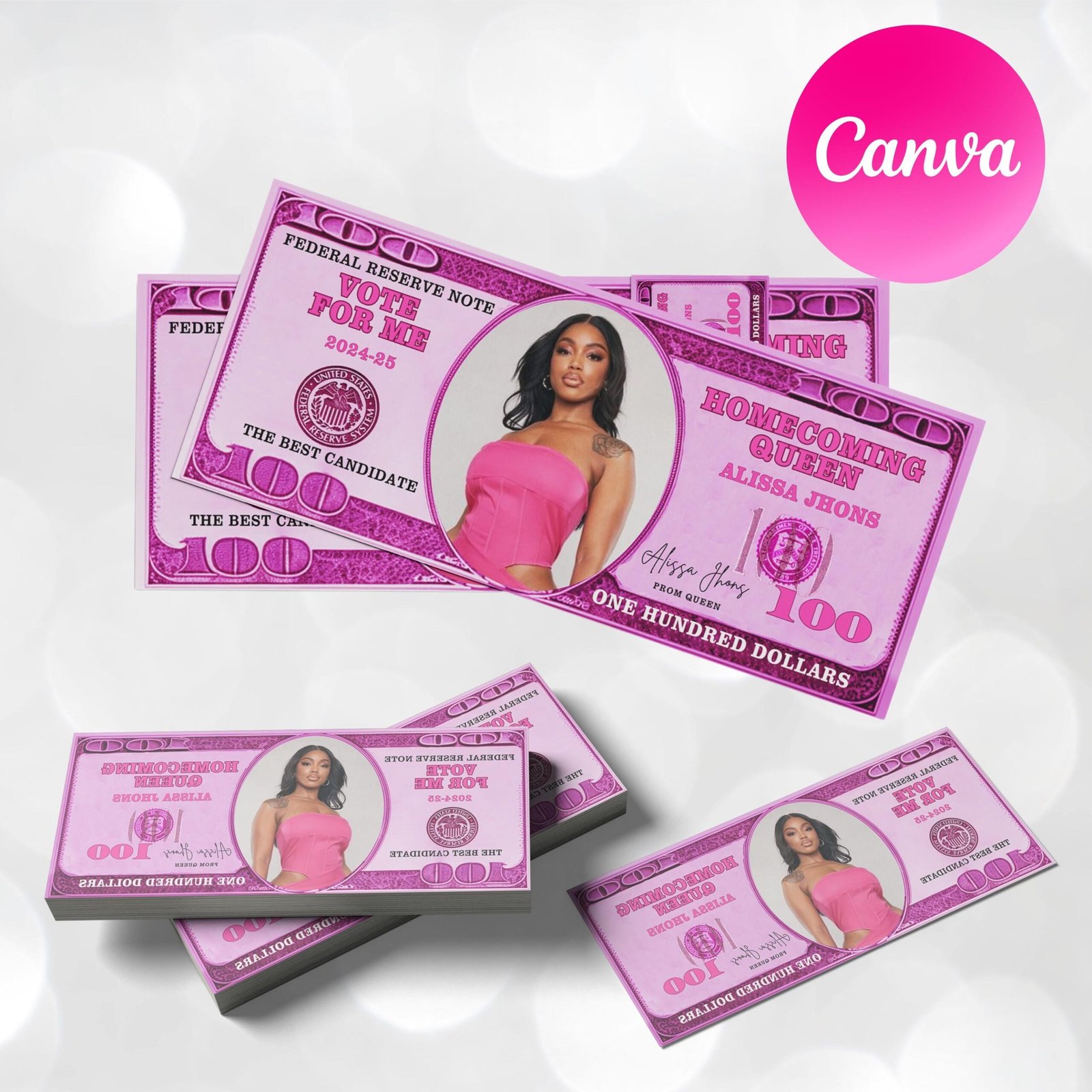 Homecoming Campaign Money, Editable Fake Money, Homecoming 100 bill, Available in 9 Colors & 2 Print Template, Prom Queen, Print and Cut