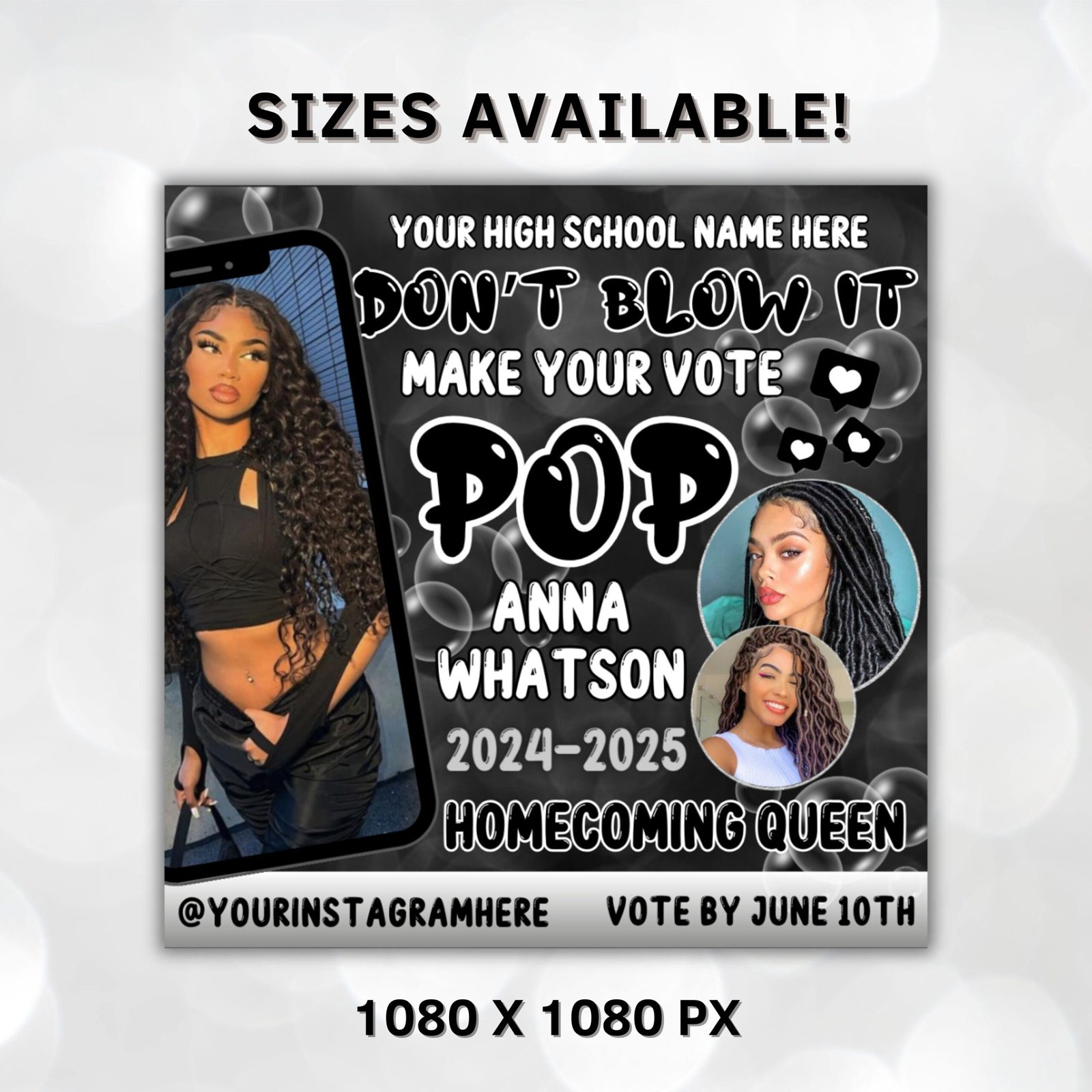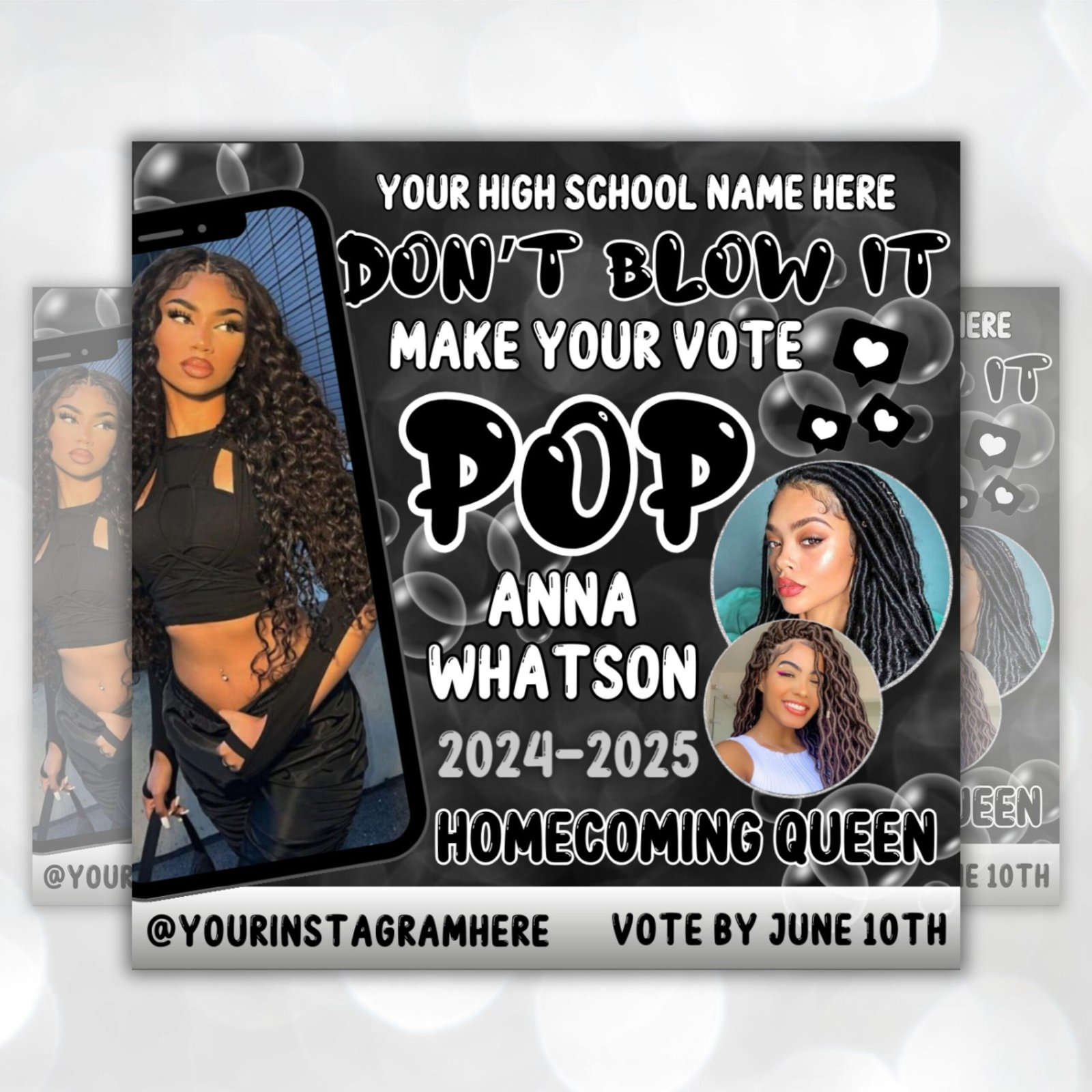 Homecoming Pop The Vote Flyer| DIY Voting Campaign Election High School Queen Beauty Social Media Instagram Snapchat Editable Canva Template