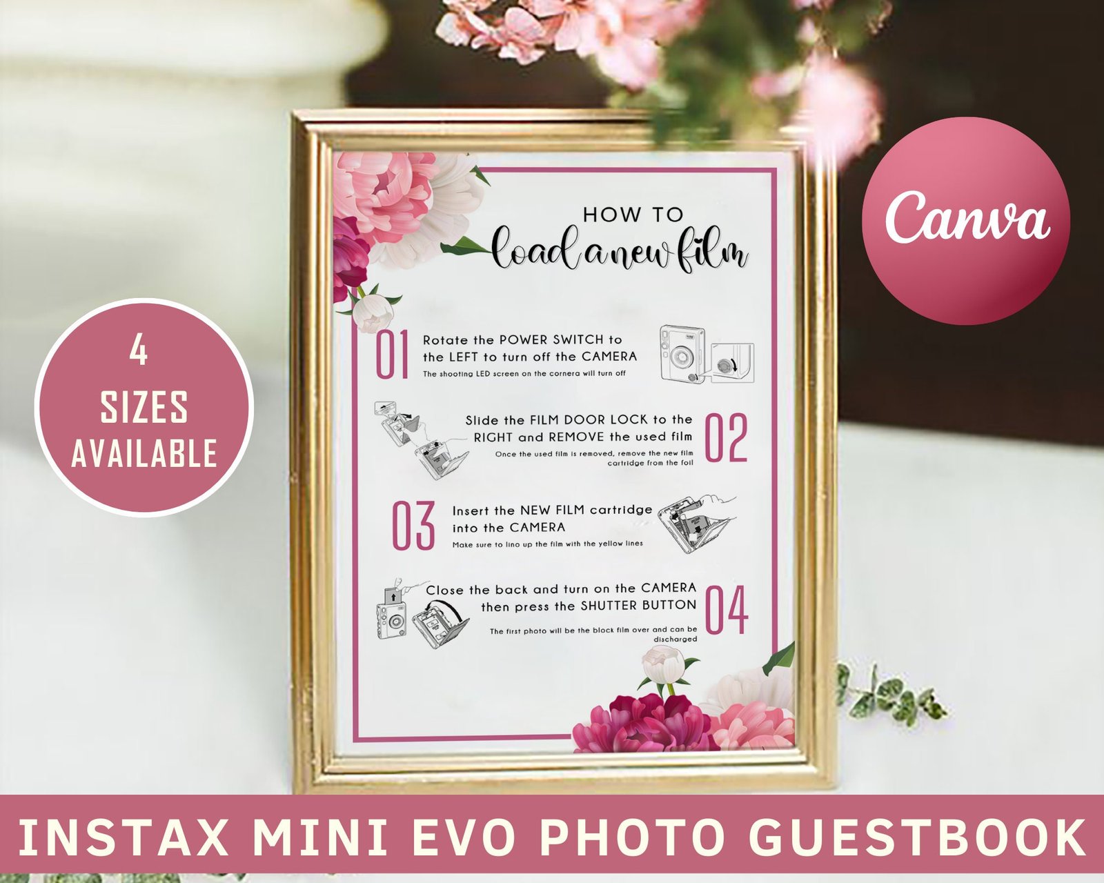 Instax mini evo photo guestbook, instax mini evo camera instructions sign, how to load a film, how to take a photo