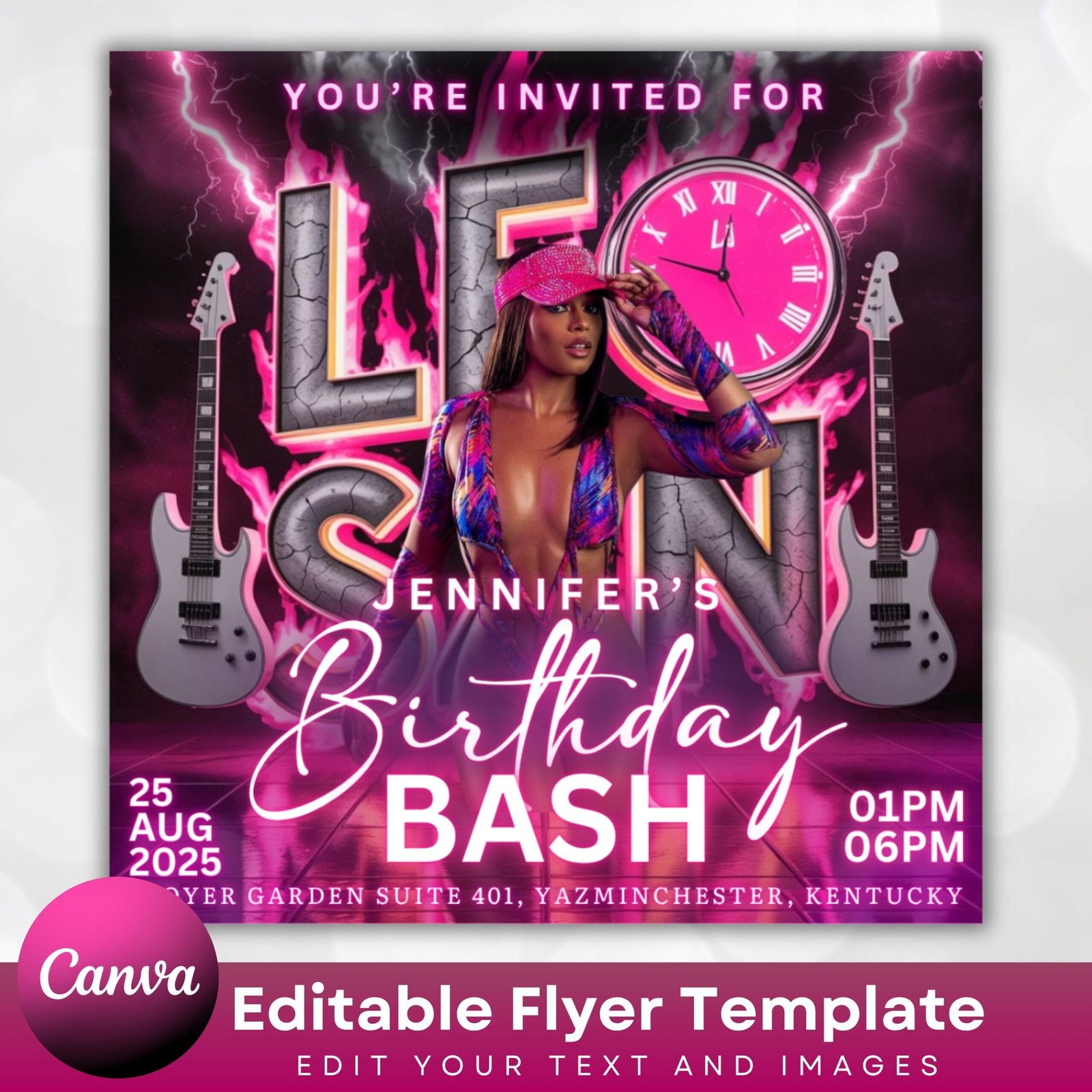 Celebrate like a true Leo with this elegant Leo Birthday Flyer Template! Perfect for promoting birthday parties, events, or club nights. Fully editable in Canva, this digital flyer features zodiac-ins
