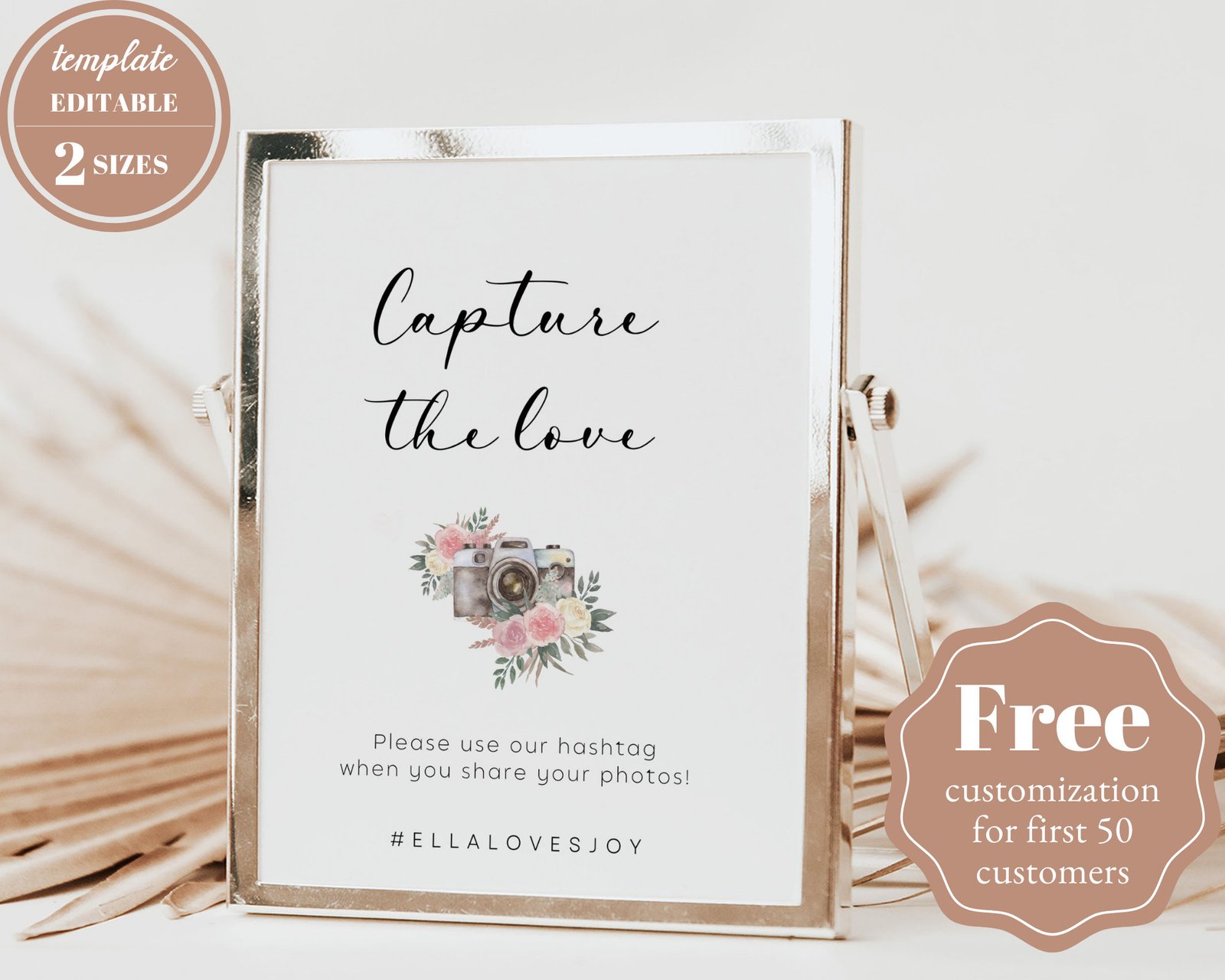 Minimalist wedding hashtag sign template, capture the love sign, wedding social media hashtag sign, modern wedding photo sign