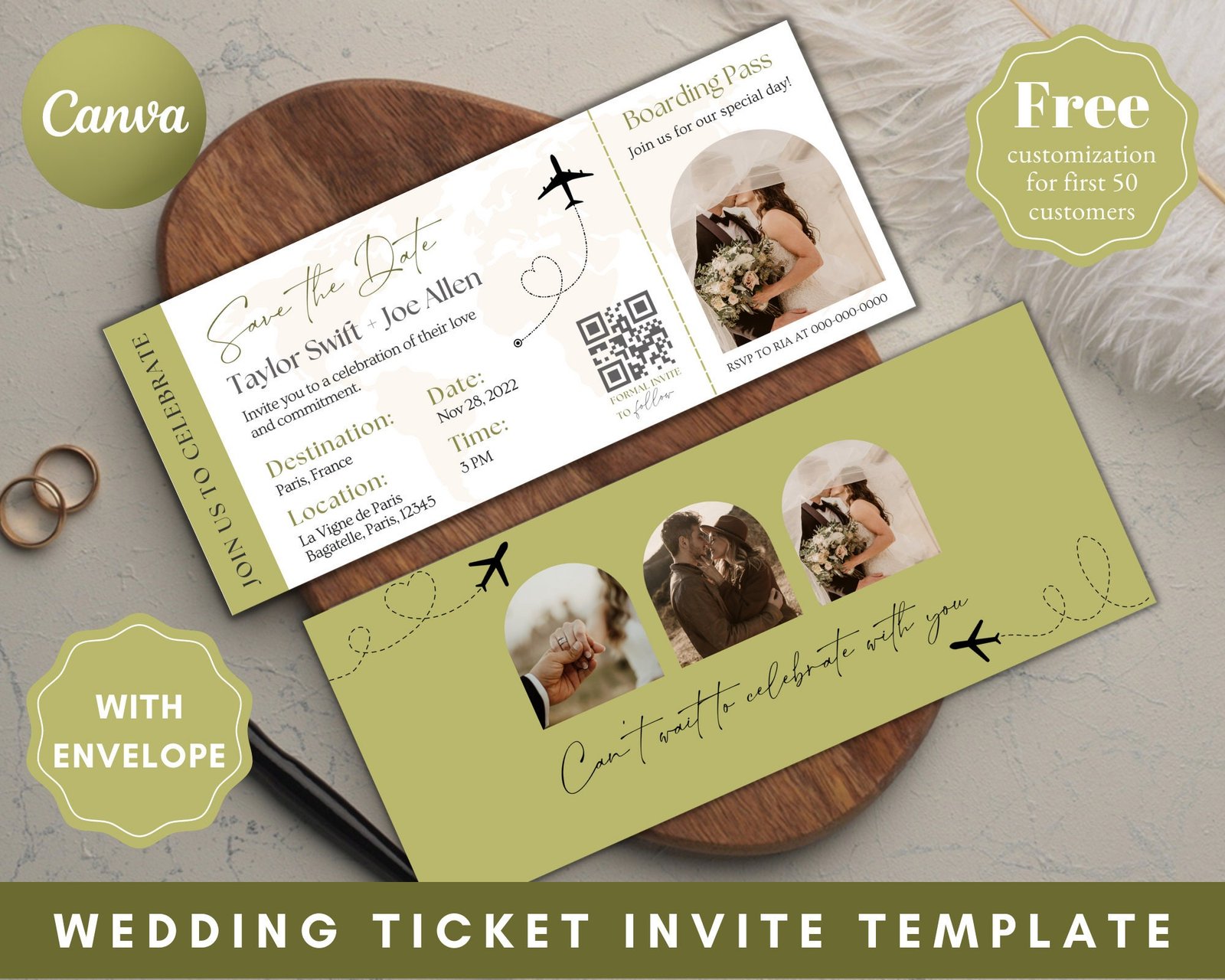 Olive green save the date ticket with photo, wedding invite, custom boarding pass, wedding invitation, ticket wedding, save the date card