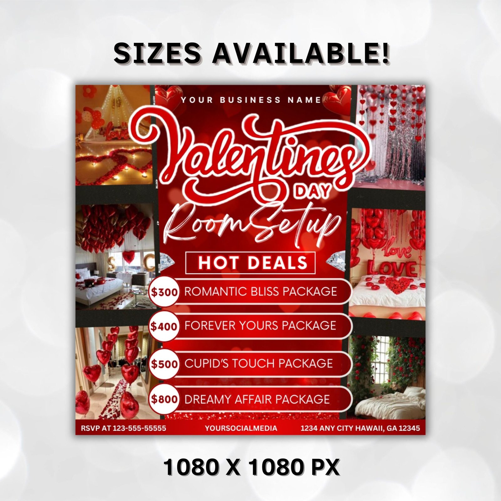 Transform your Valentine’s Day celebrations with our **Room Setup Valentines Booking Flyer**! This beautiful Canva template features elegant graphics and customizable text, allowing you to create the