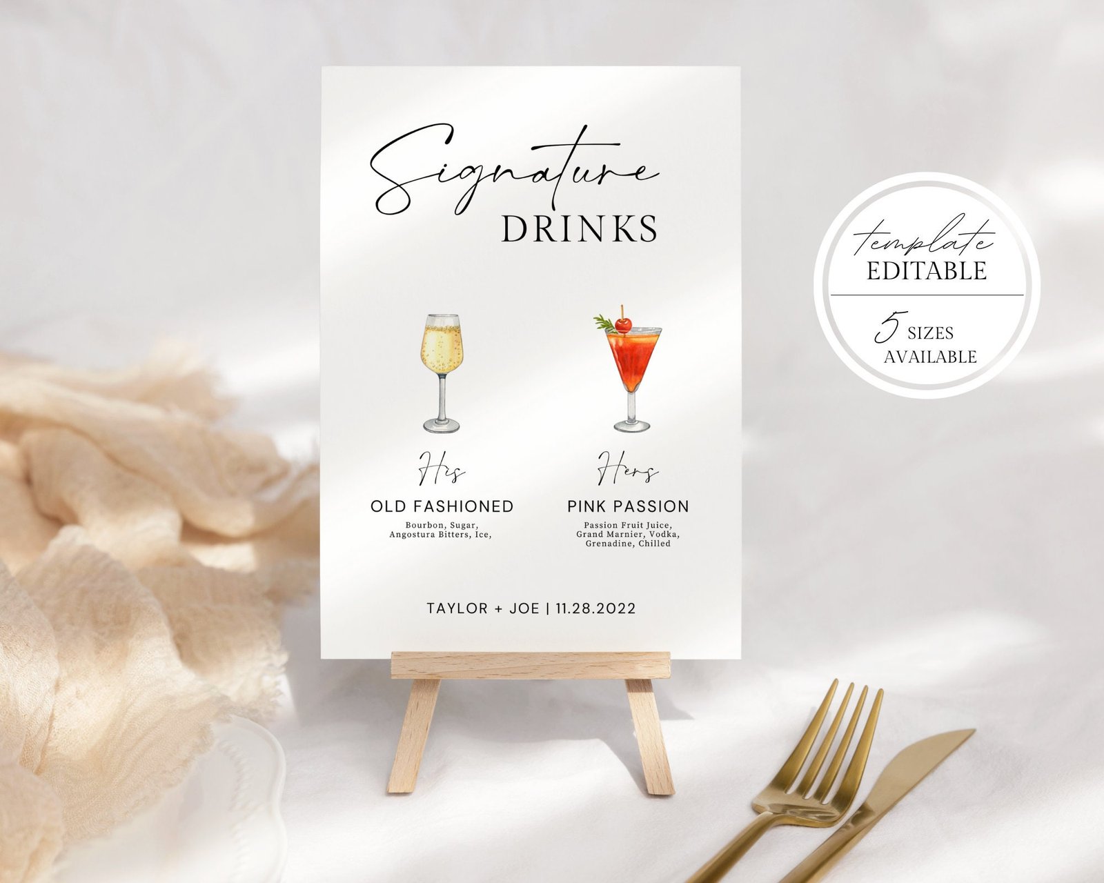 Signature drinks sign template | signature cocktail sign | minimalist wedding bar menu poster | his + hers bar sign | editable menu template