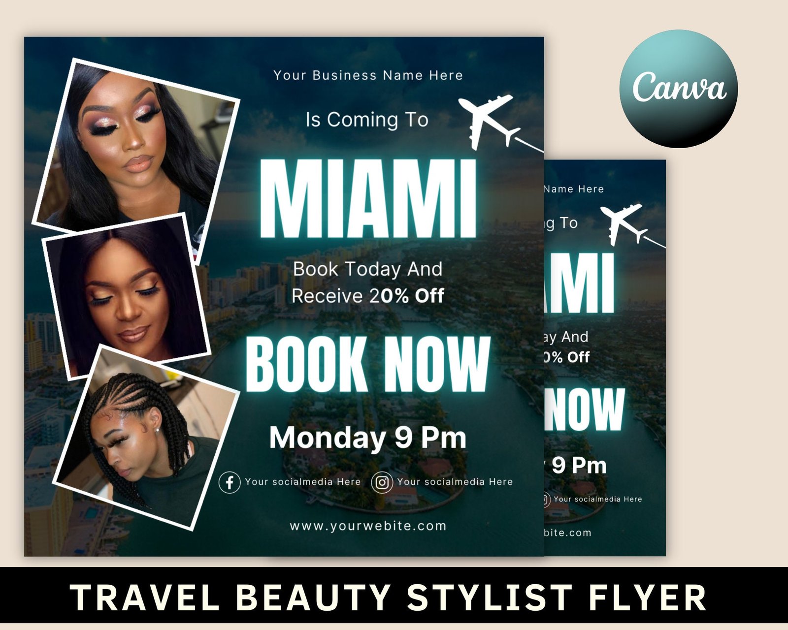 Travel beauty stylist flyer, traveling business flyer, diy book now appointments, traveling hairstylist, editable canva template